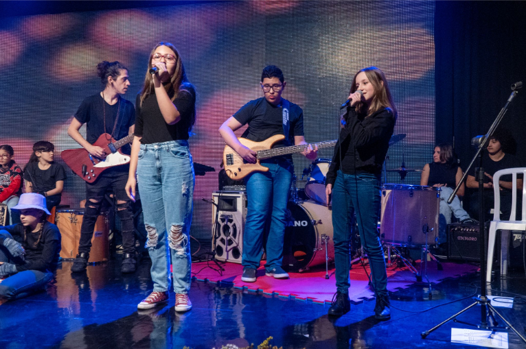 O curso proporciona o desenvolvimento da consciência musical e o domínio das dinâmicas de uma apresentação em grupo, respeitando o espaço e a função de cada instrumento. Aplicação de técnicas musicais com guitarra, teclado, contrabaixo e violão.